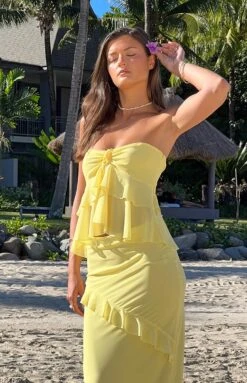 Brighten up your summer wardrobe with this vibrant yellow ruffle strapless top. Perfect for beach days and warm evenings. Style it with mini skirt or high-waisted denim shorts and sandals for a chic, casual outfit. Don’t forget to accessorise with gold jewellery and straw bag for the ultimate sunny-day style.
