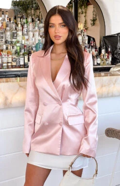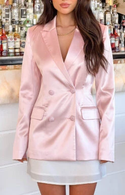 Embrace a sophisticated yet playful look with our Pink Satin Blazer, perfect for brunches, business meetings, or a stylish day out. Pair it with a fitted white mini skirt and a simple tank top for a chic and polished ensemble. Complete the look with nude or white heels and minimal gold jewellery to maintain a refined aesthetic.