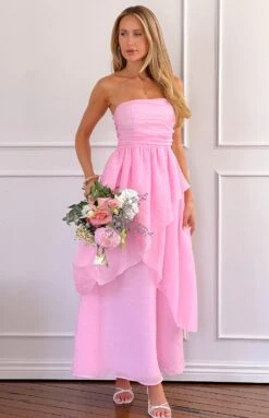 Channel your inner princess with our Sadie Pink Maxi Dress! Perfect for your next birthday, formal or daytime event this style has a beautiful gathered bust material, layered skirt detailing and strapless style! Pair with white heels and matching purse to complete the look!