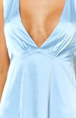 - Jaws will drop when you wear this stunning blue satin mini dress! Looking like cinderella, add a pair of stunning white heels and dainty gold jewellery and a white back to complete the look! Everyone loves a cute simple mini dress that can easily be dressed up or down! This dress is also perfect for you next cocktail event or even homecoming!