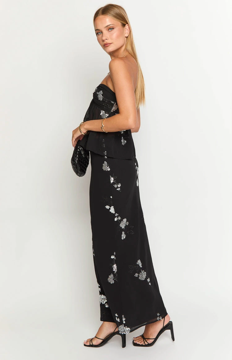 Add a touch of glamour to your wardrobe with our Shyla Black Sequined Floral Print Maxi Skirt! Featuring a stunning floral embroidered design with sequin detailing, this skirt is perfect for a night out or a special event. Pair it with the matching Shyla Strapless Top for a matching moment, finishing with black heels and silver jewellery to tie your look together!