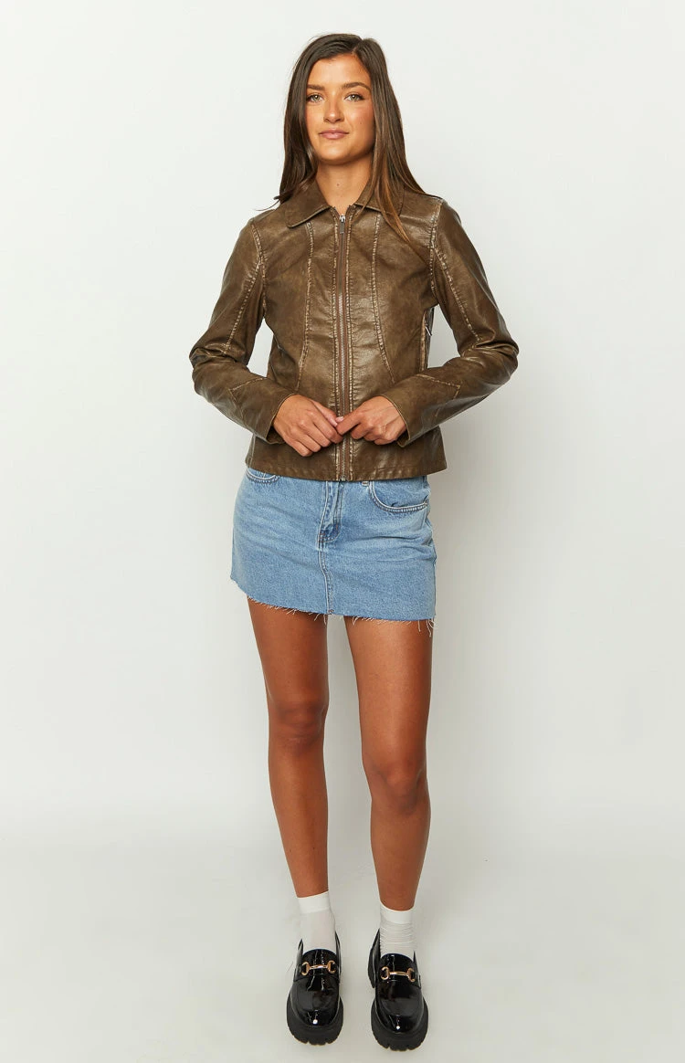 - A street style staple! In this vintage brown, it pairs perfectly with denim jeans, making it the perfect jacket for fall! Add a white crop top and sneakers to complete the look!