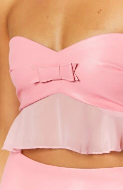 - Our pink bow crop top is just the sweetest! She’s a dream when paired with the matching mini skirt. Elevate the look with heels, a shoulder bag, and chunky jewellery for the perfect party fit.