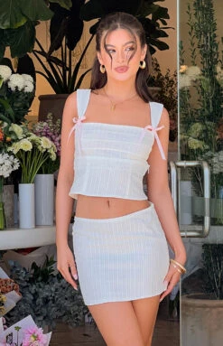 Our best selling Taylor White Mini Dress has arrived in a cropped top. This feminine top features a cropped length, delicate embroidery fabric, and a lace trim under the bust with removable pink and black bows. Style this versatile top with a mini skirt for a chic and elevated outfit. Perfect for a date night or a girls’ night out.