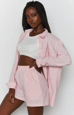 - Add a playful pop of pink to your wardrobe with these pink pinstripe shorts! Their light-weight comfy fabric is perfect for lazy days when you still wanna look cute – pair them with the matching shirt as a set for a relaxed but polished daytime look!
