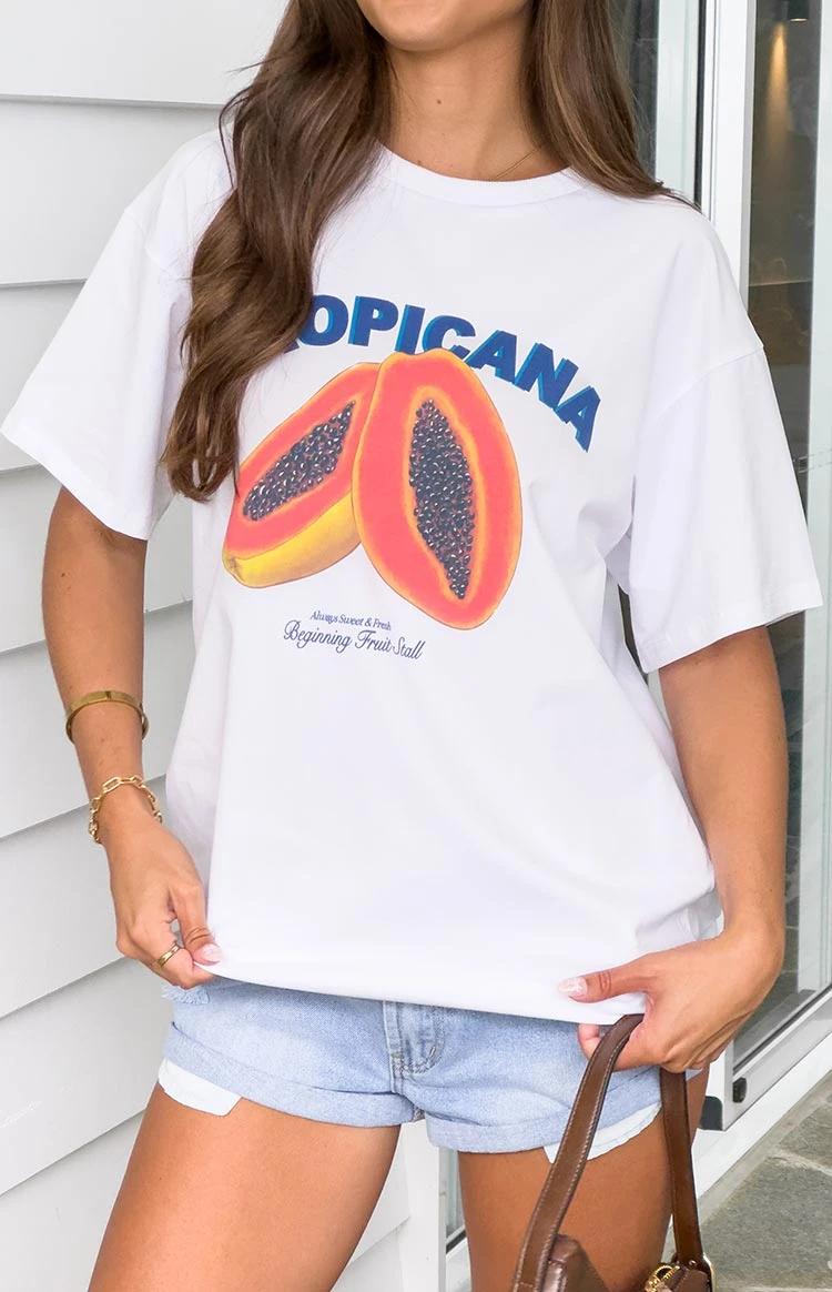 Add a playful touch of summer to your wardrobe with our Tropicana White Tee! Featuring an oversized fit, ribbed collar, and a unique graphic print, this tee combines effortless comfort with casual style. Whether you’re heading out for a laid-back day or studying at university, pair it with your favourite jeans and sneakers for a cool, everyday look!