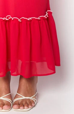 The Wiatt Red Maxi Skirt is your new wardrobe favourite for creating unforgettable looks. Crafted from flowy red chiffon, this maxi skirt features a delicate white-trimmed ruffle detail. Whether you’re dressing it up for a formal dinner or styling it casually for a daytime outing, this versatile piece brings effortless charm to any occasion. Pair it with a fitted crop top and strappy heels for a night out, or keep it relaxed with a simple tank and sandals.